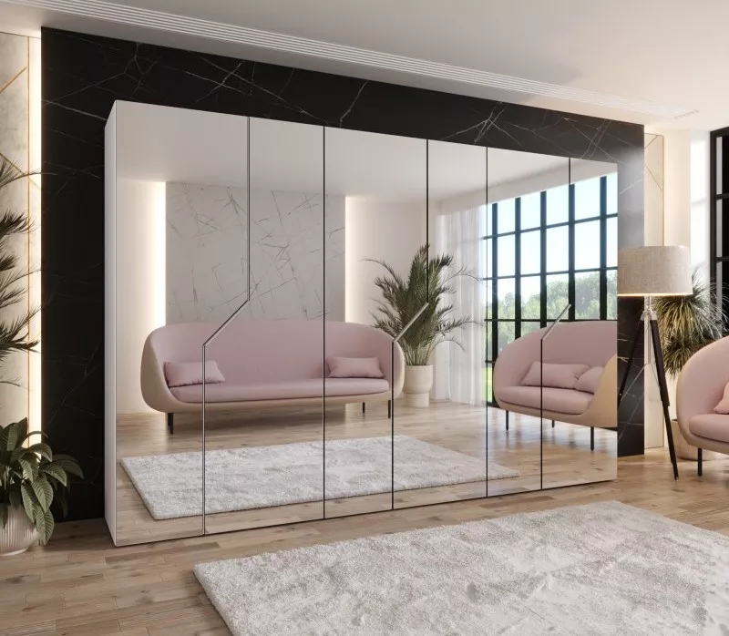 Široká zrcadlová skříň 300 cm ELIRA 3 zaujme především svým minimalistickým provedením, díky kterému skvěle zapadne do všech stylů ložnic. Skříň disponuje zrcadly, 3 šatními tyčemi a 3 horními policemi pro uložení bot nebo úložných boxů. Systém tichého dovírání zpříjemní každodenní používání.