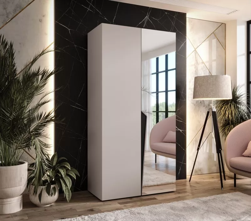Šatní zrcadlová skříň 100 cm SORAYA 2 ozvláštní svým designovým úchytem každou místnost. Skříň je vybavená zrcadlem, šatní tyčí a horní policí pro uložení úložných boxů nebo doplňků. Systém tichého dovírání zpříjemní každodenní používání.