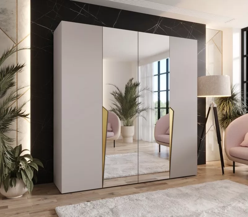 Čtyřdveřová šatní skříň 200 cm SORAYA 2 ozvláštní svými designovými úchyty každou místnost. Skříň je vybavená zrcadly, 2 šatními tyčemi a 2 horními policemi pro uložení úložných boxů nebo doplňků. Systém tichého dovírání zpříjemní každodenní používání.