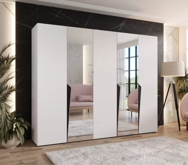 Široká šatní skříň 250 cm SORAYA 2 se zrcadlem - bílá / černé úchyty