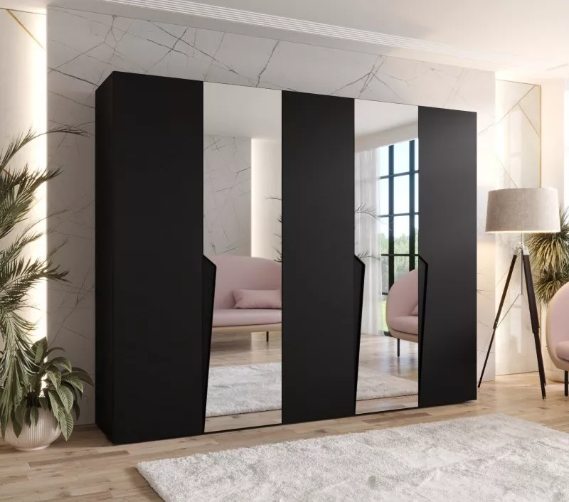 Široká šatní skříň 250 cm SORAYA 2 se zrcadlem - černá / černé úchyty