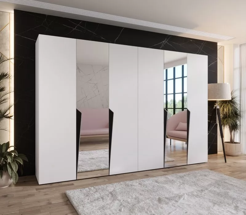 Zrcadlová šatní skříň 300 cm SORAYA 2 - bílá / černé úchyty
