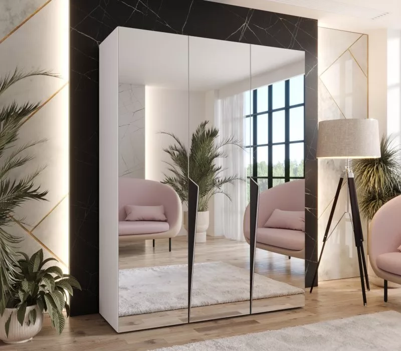 Elegantní zrcadlová skříň 150 cm SORAYA 3 ozvláštní svými designovými úchyty každou místnost. Skříň je vybavená zrcadly, 2 šatními tyčemi a 2 horními policemi pro uložení úložných boxů nebo doplňků. Systém tichého dovírání zpříjemní každodenní používání.