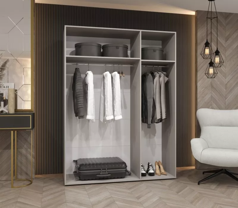 Elegantní zrcadlová skříň 150 cm SORAYA 3 ozvláštní svými designovými úchyty každou místnost. Skříň je vybavená zrcadly, 2 šatními tyčemi a 2 horními policemi pro uložení úložných boxů nebo doplňků. Systém tichého dovírání zpříjemní každodenní používání.