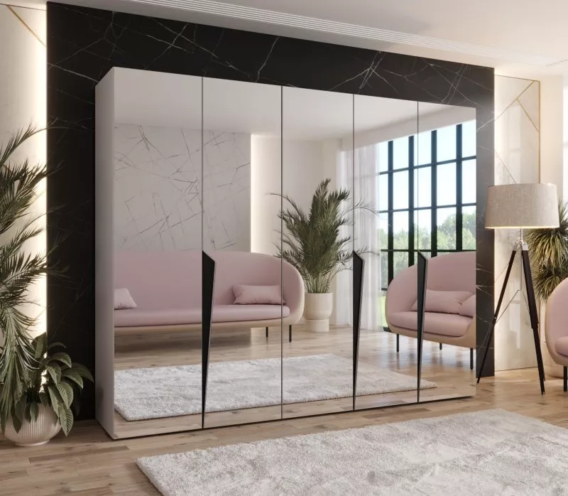 Široká šatní skříň 250 cm SORAYA 3 se zrcadlem ozvláštní svými designovými úchyty každou místnost. Skříň je vybavená zrcadly, 3 šatními tyčemi a 3 horními policemi pro uložení úložných boxů nebo doplňků. Systém tichého dovírání zpříjemní každodenní používání.