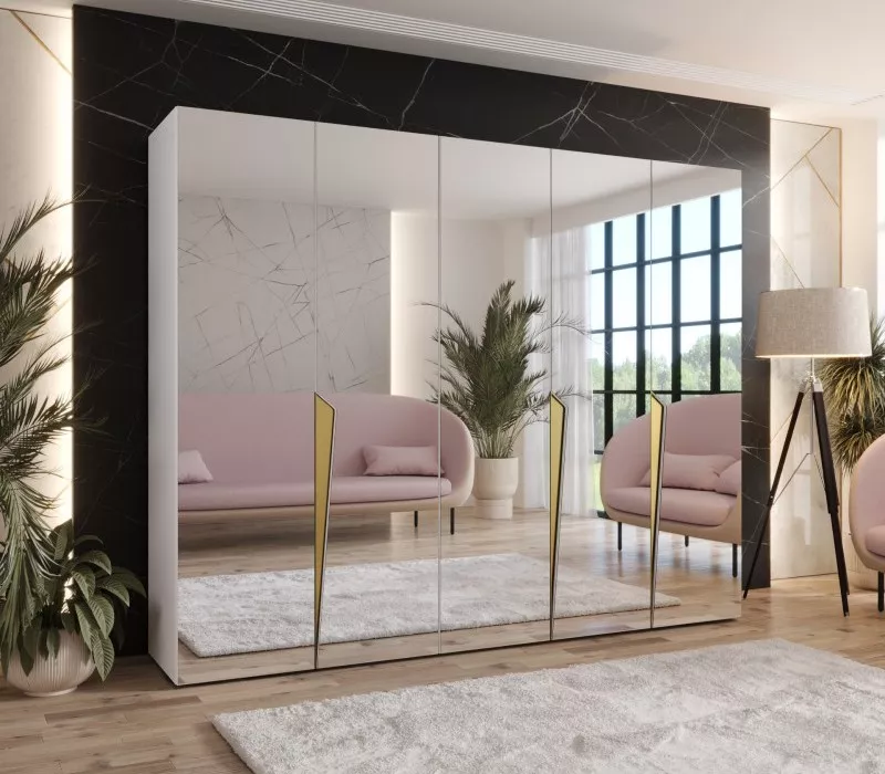 Široká šatní skříň 250 cm SORAYA 3 se zrcadlem - bílá / zlaté úchyty