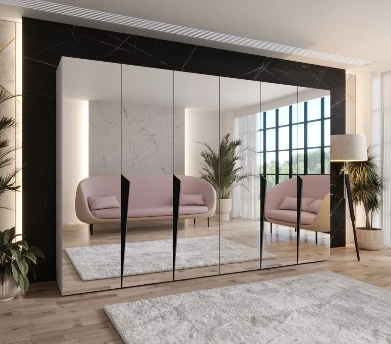 Šatní zrcadlová skříň 300 cm SORAYA 3 ozvláštní svými designovými úchyty každou místnost. Skříň je vybavená zrcadly, 4 šatními tyčemi a 4 horními policemi pro uložení úložných boxů nebo doplňků. Systém tichého dovírání zpříjemní každodenní používání.