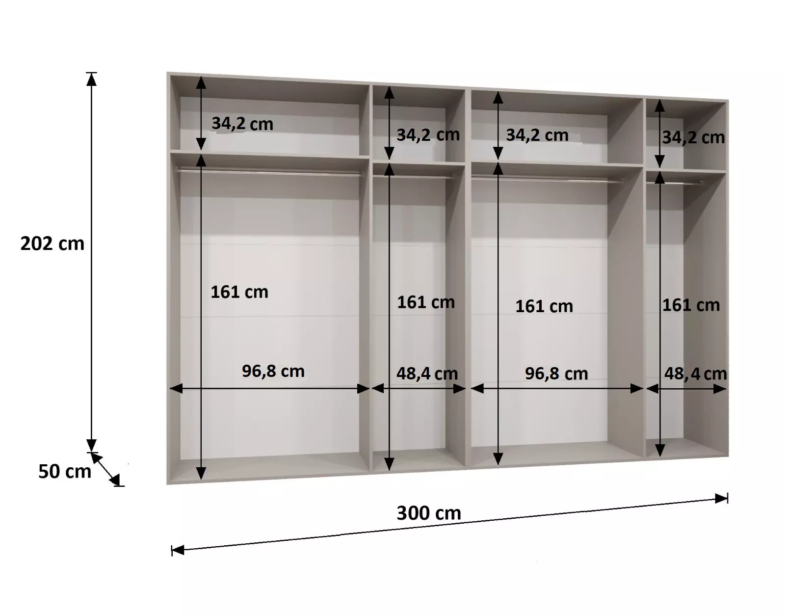 Šatní zrcadlová skříň 300 cm SORAYA 3 ozvláštní svými designovými úchyty každou místnost. Skříň je vybavená zrcadly, 4 šatními tyčemi a 4 horními policemi pro uložení úložných boxů nebo doplňků. Systém tichého dovírání zpříjemní každodenní používání.
