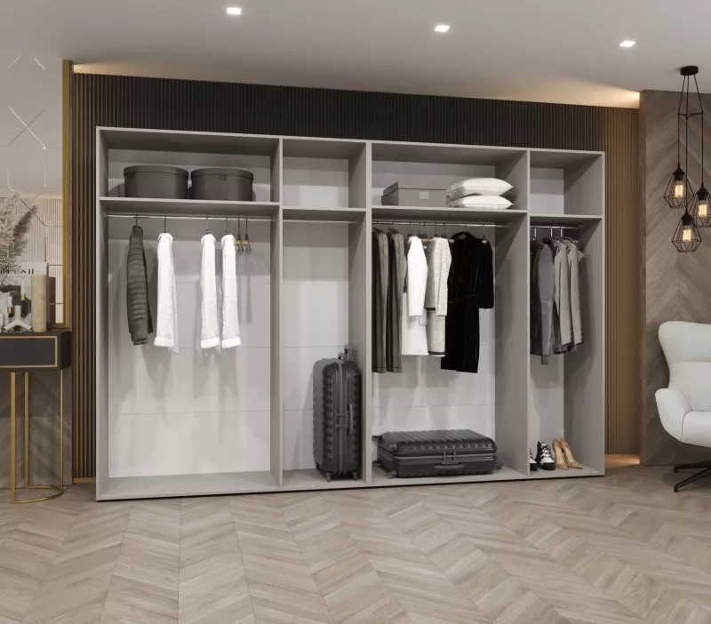 Šatní zrcadlová skříň 300 cm SORAYA 3 ozvláštní svými designovými úchyty každou místnost. Skříň je vybavená zrcadly, 4 šatními tyčemi a 4 horními policemi pro uložení úložných boxů nebo doplňků. Systém tichého dovírání zpříjemní každodenní používání.