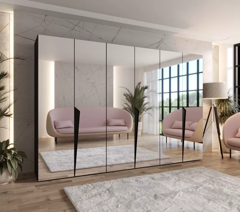 Velká šatní skříň 300 cm SORAYA 3 se zrcadlem ozvláštní svými designovými úchyty každou místnost. Skříň je vybavená zrcadly, 3 šatními tyčemi a 3 horními policemi pro uložení úložných boxů nebo doplňků. Systém tichého dovírání zpříjemní každodenní používání.