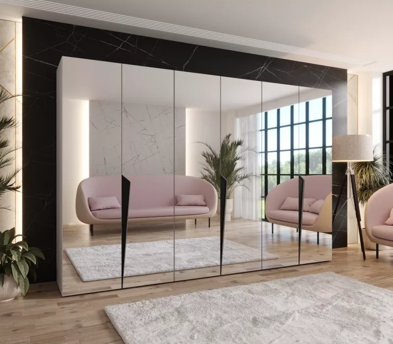 Velká šatní skříň 300 cm SORAYA 3 se zrcadlem ozvláštní svými designovými úchyty každou místnost. Skříň je vybavená zrcadly, 3 šatními tyčemi a 3 horními policemi pro uložení úložných boxů nebo doplňků. Systém tichého dovírání zpříjemní každodenní používání.