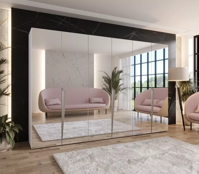 Velká šatní skříň 300 cm SORAYA 3 se zrcadlem ozvláštní svými designovými úchyty každou místnost. Skříň je vybavená zrcadly, 3 šatními tyčemi a 3 horními policemi pro uložení úložných boxů nebo doplňků. Systém tichého dovírání zpříjemní každodenní používání.