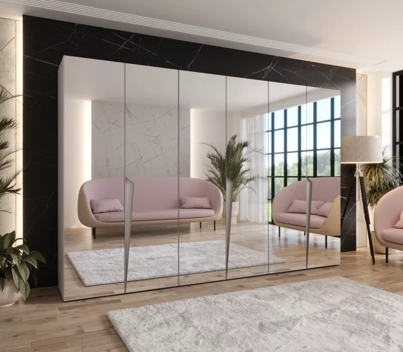 Velká šatní skříň 300 cm SORAYA 3 se zrcadlem ozvláštní svými designovými úchyty každou místnost. Skříň je vybavená zrcadly, 3 šatními tyčemi a 3 horními policemi pro uložení úložných boxů nebo doplňků. Systém tichého dovírání zpříjemní každodenní používání.