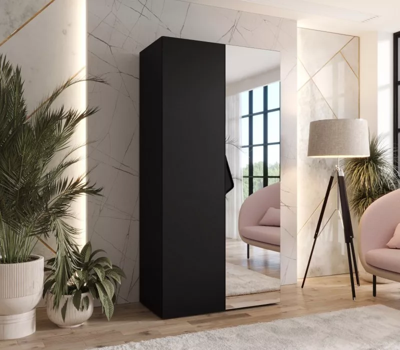 Úzká šatní skříň 100 cm AMARIS 2 se zrcadlem jistě upoutá pozornost všech nadšenců minimalistického stylu. Vnitřní uspořádání v podobě šatní tyče a horní police vám umožní zavěsit a uložit vše potřebné. Skříň je vybavená systémem tichého dovírání, což zpříjemní každodenní používání.