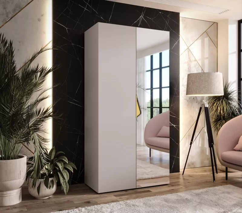 Úzká šatní skříň 100 cm AMARIS 2 se zrcadlem jistě upoutá pozornost všech nadšenců minimalistického stylu. Vnitřní uspořádání v podobě šatní tyče a horní police vám umožní zavěsit a uložit vše potřebné. Skříň je vybavená systémem tichého dovírání, což zpříjemní každodenní používání.