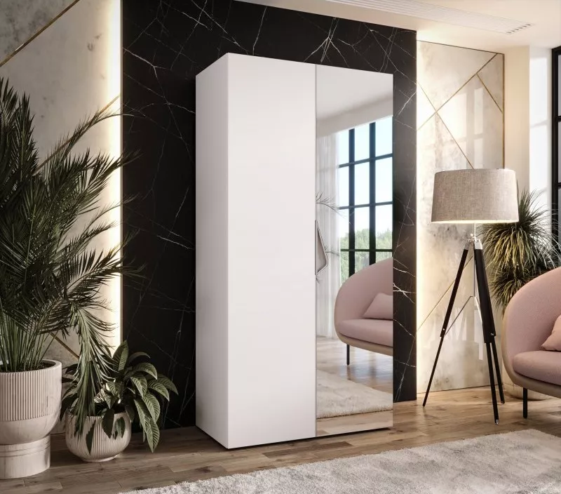 Úzká šatní skříň 100 cm AMARIS 2 se zrcadlem jistě upoutá pozornost všech nadšenců minimalistického stylu. Vnitřní uspořádání v podobě šatní tyče a horní police vám umožní zavěsit a uložit vše potřebné. Skříň je vybavená systémem tichého dovírání, což zpříjemní každodenní používání.