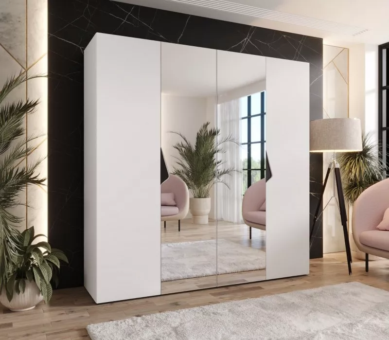 Čtyřdveřová zrcadlová skříň 200 cm AMARIS 2 jistě upoutá pozornost všech nadšenců minimalistického stylu. Vnitřní uspořádání v podobě šatních tyčí a horních polic vám umožní zavěsit a uložit vše potřebné. Skříň je vybavená systémem tichého dovírání, což zpříjemní každodenní používání.
