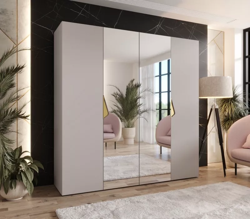 Čtyřdveřová zrcadlová skříň 200 cm AMARIS 2 jistě upoutá pozornost všech nadšenců minimalistického stylu. Vnitřní uspořádání v podobě šatních tyčí a horních polic vám umožní zavěsit a uložit vše potřebné. Skříň je vybavená systémem tichého dovírání, což zpříjemní každodenní používání.