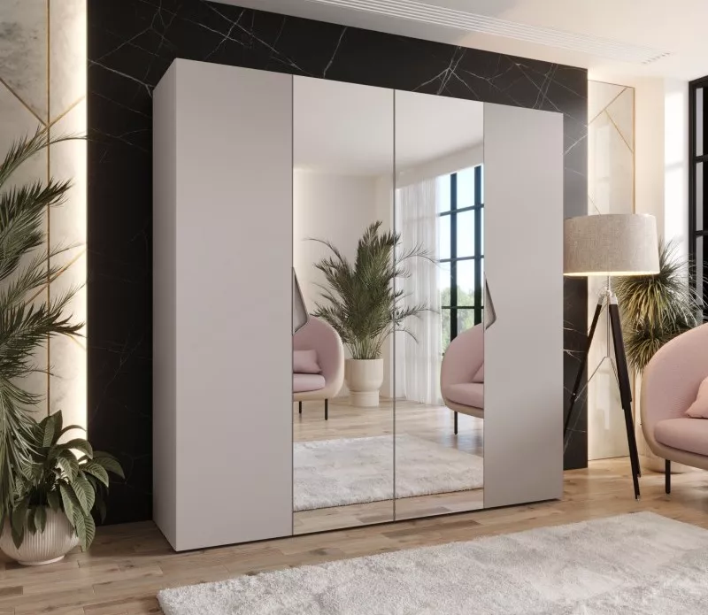 Čtyřdveřová zrcadlová skříň 200 cm AMARIS 2 jistě upoutá pozornost všech nadšenců minimalistického stylu. Vnitřní uspořádání v podobě šatních tyčí a horních polic vám umožní zavěsit a uložit vše potřebné. Skříň je vybavená systémem tichého dovírání, což zpříjemní každodenní používání.