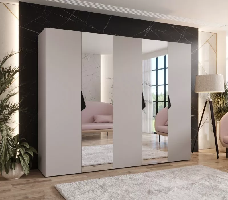 Široká šatní skříň 250 cm AMARIS 2 se zrcadlem jistě upoutá pozornost všech nadšenců minimalistického stylu. Vnitřní uspořádání v podobě šatních tyčí a horních polic vám umožní zavěsit a uložit vše potřebné. Skříň je vybavená systémem tichého dovírání, což zpříjemní každodenní používání.