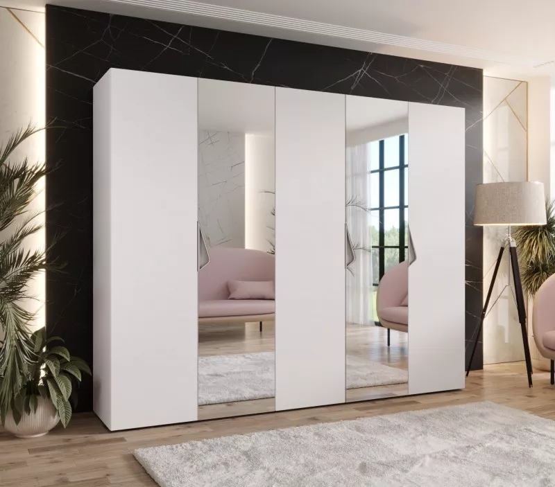 Široká šatní skříň 250 cm AMARIS 2 se zrcadlem jistě upoutá pozornost všech nadšenců minimalistického stylu. Vnitřní uspořádání v podobě šatních tyčí a horních polic vám umožní zavěsit a uložit vše potřebné. Skříň je vybavená systémem tichého dovírání, což zpříjemní každodenní používání.
