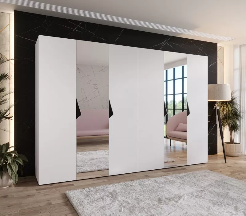 Elegantní zrcadlová skříň 300 cm AMARIS 2 jistě upoutá pozornost všech nadšenců minimalistického stylu. Vnitřní uspořádání v podobě šatních tyčí a horních polic vám umožní zavěsit a uložit vše potřebné. Skříň je vybavená systémem tichého dovírání, což zpříjemní každodenní používání.