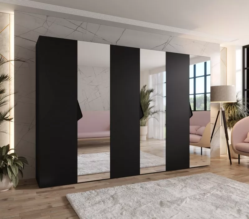 Velká zrcadlová šatní skříň 300 cm AMARIS 2 - černá / černé úchyty