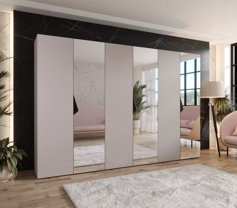 Velká zrcadlová šatní skříň 300 cm AMARIS 2 - kašmír / černé úchyty