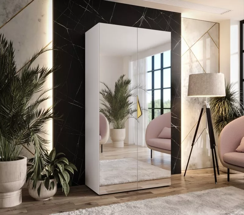 Úzká zrcadlová skříň 100 cm AMARIS 3 jistě upoutá pozornost všech nadšenců minimalistického stylu. Vnitřní uspořádání v podobě šatní tyče a horní police vám umožní zavěsit a uložit vše potřebné. Skříň je vybavená systémem tichého dovírání, což zpříjemní každodenní používání.