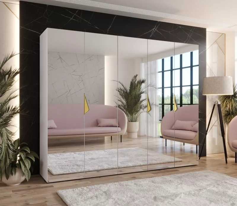 Široká šatní skříň 250 cm AMARIS 3 se zrcadlem - bílá / zlaté úchyty