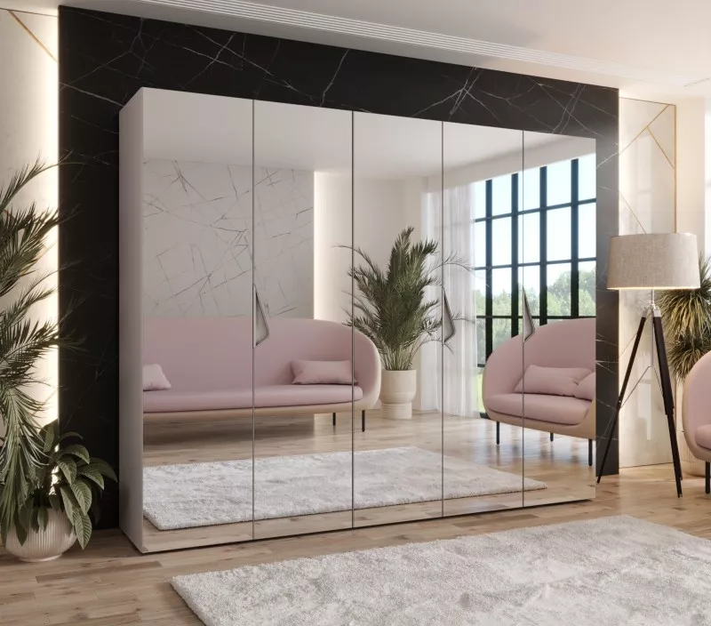 Široká šatní skříň 250 cm AMARIS 3 se zrcadlem jistě upoutá pozornost všech nadšenců minimalistického stylu. Vnitřní uspořádání v podobě šatních tyčí a horních polic vám umožní zavěsit a uložit vše potřebné. Skříň je vybavená systémem tichého dovírání, což zpříjemní každodenní používání.