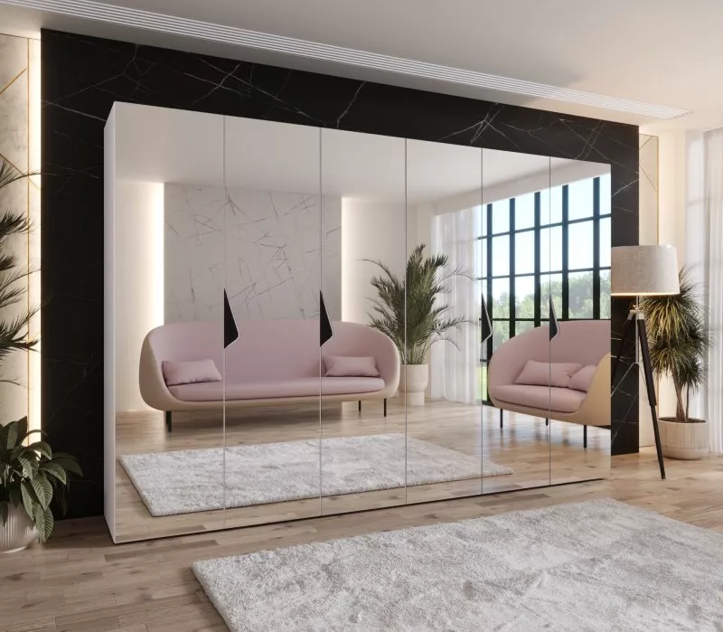 Zrcadlová šestidveřová šatní skříň 300 cm AMARIS 3 jistě upoutá pozornost všech nadšenců minimalistického stylu. Vnitřní uspořádání v podobě šatních tyčí a horních polic vám umožní zavěsit a uložit vše potřebné. Skříň je vybavená systémem tichého dovírání, což zpříjemní každodenní používání.