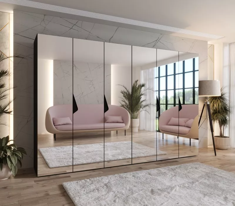Zrcadlová šestidveřová šatní skříň 300 cm AMARIS 3 jistě upoutá pozornost všech nadšenců minimalistického stylu. Vnitřní uspořádání v podobě šatních tyčí a horních polic vám umožní zavěsit a uložit vše potřebné. Skříň je vybavená systémem tichého dovírání, což zpříjemní každodenní používání.