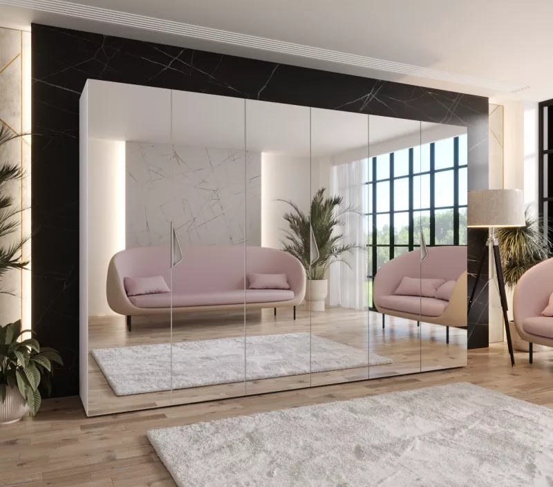 Velká zrcadlová skříň 300 cm AMARIS 3 jistě upoutá pozornost všech nadšenců minimalistického stylu. Vnitřní uspořádání v podobě šatních tyčí a horních polic vám umožní zavěsit a uložit vše potřebné. Skříň je vybavená systémem tichého dovírání, což zpříjemní každodenní používání.