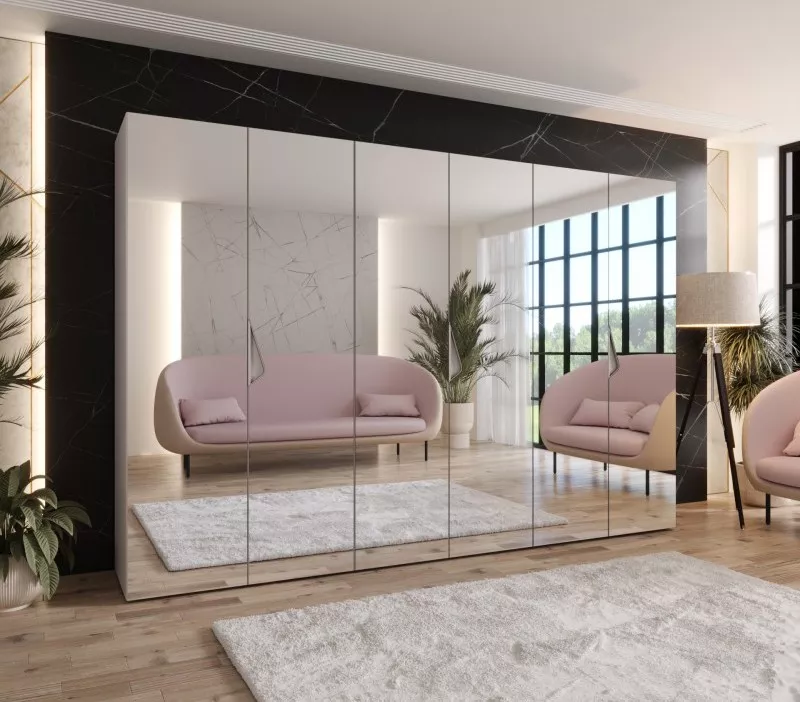 Velká zrcadlová skříň 300 cm AMARIS 3 jistě upoutá pozornost všech nadšenců minimalistického stylu. Vnitřní uspořádání v podobě šatních tyčí a horních polic vám umožní zavěsit a uložit vše potřebné. Skříň je vybavená systémem tichého dovírání, což zpříjemní každodenní používání.